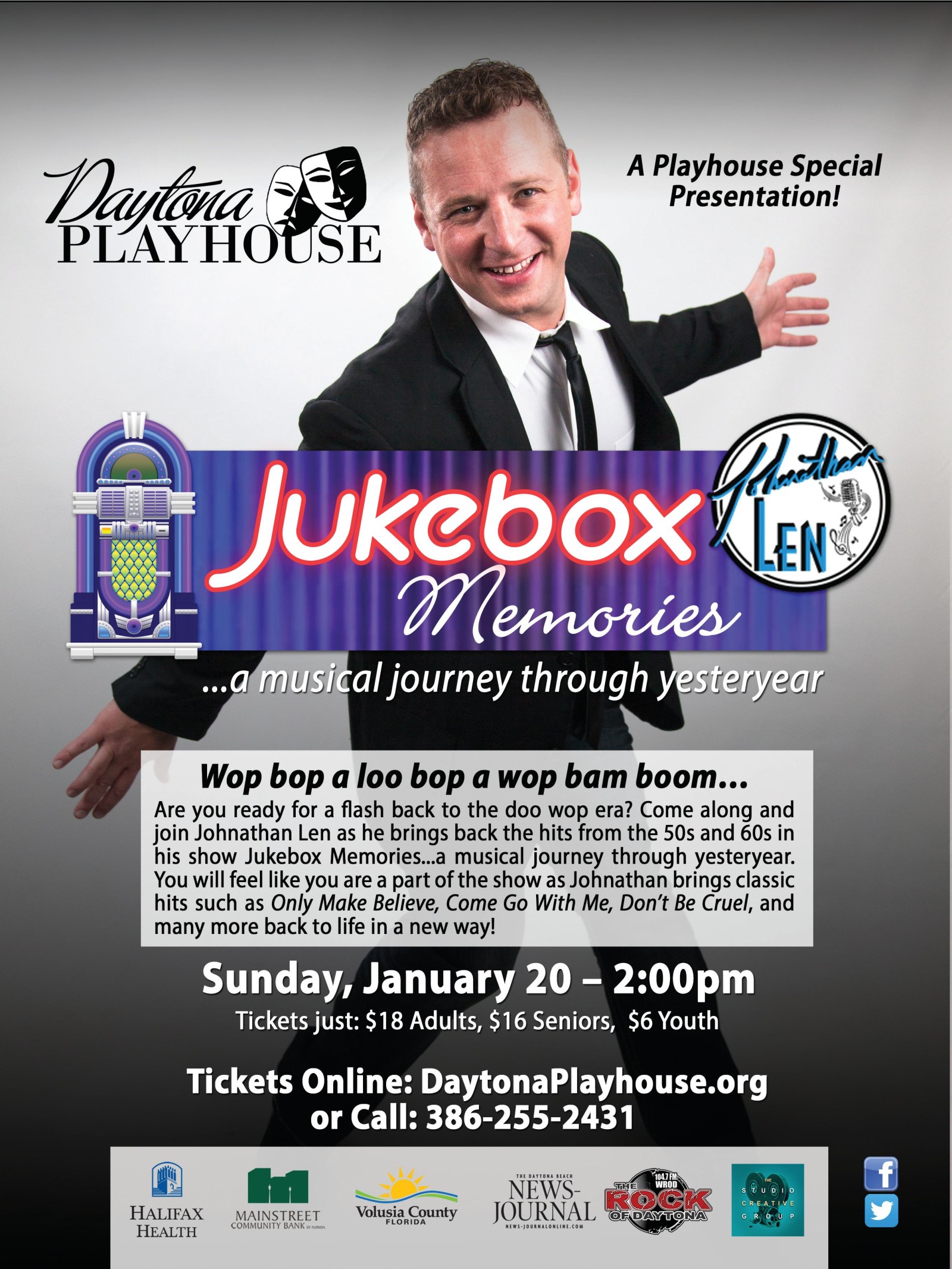 Wop bop a loo bop a wop bam boom... Are you ready for a flash back to the doo wop era? Come along and join Johnathan Len as he brings back the hits from the 50s and 60s in his show Jukebox Memories...a musical journey through yesteryear. You will feel like you are a part of the show as Johnathan brings classic hits such as Only Make Believe, Come Go With Me, Donโt Be Cruel, and many more back to life in a new way!
