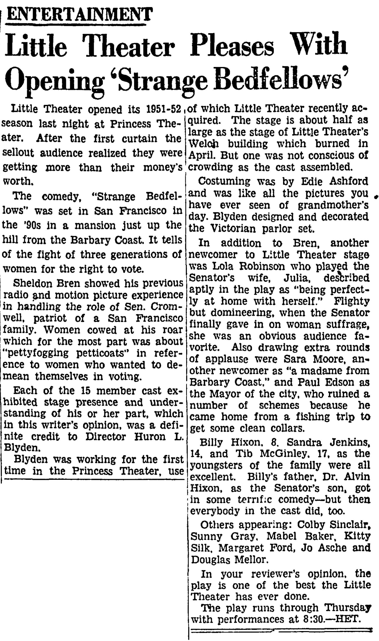 First production at the Princess Theatre following the fire at Welch Auditorium. The venue was updated with new paint, draperies and furnishings from The Casements (former winter home of the late John D. Rockefeller) which were donated by Miss Maud Van Woy (headmistress of The Fairmont-Casements