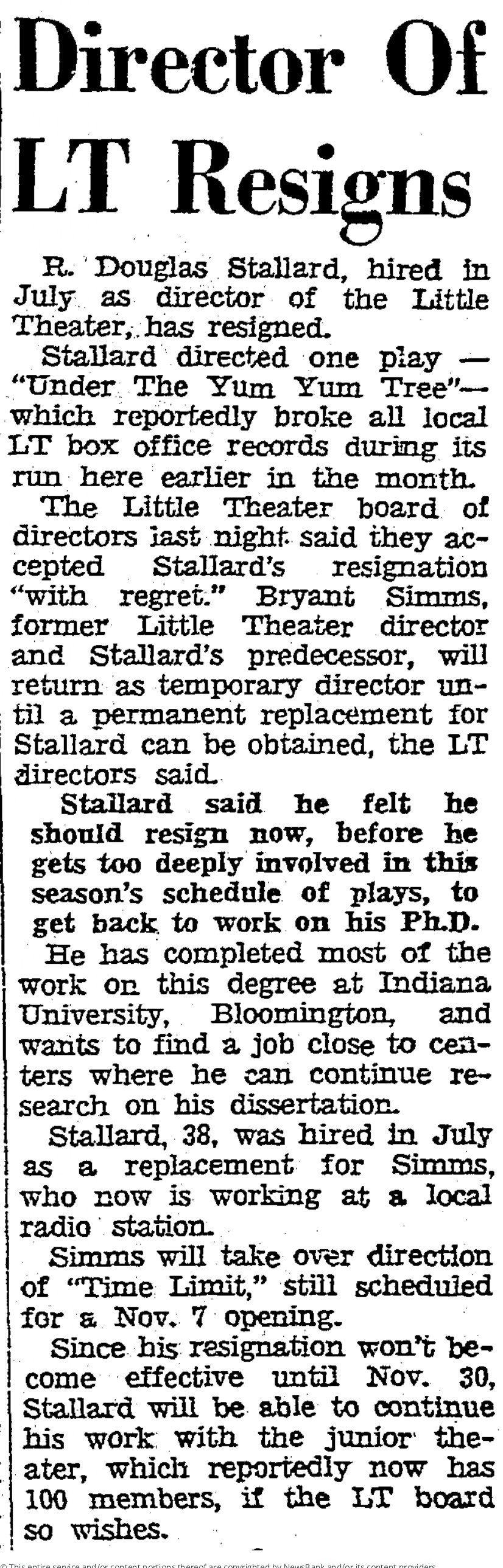 Artistic Director R. Douglas Stallard resigned on October 31, 1963, after production began. He was replaced by the former Artistic Director, Bryant Simms.