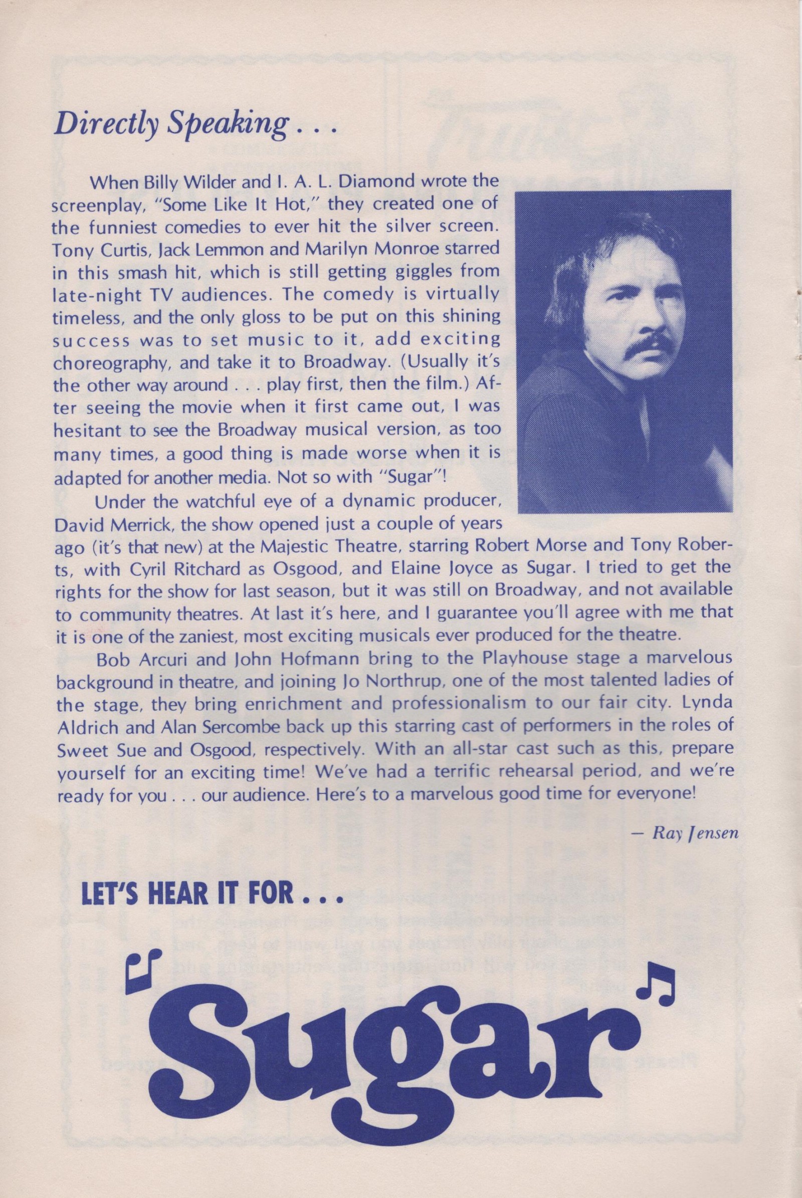 Book by Peter Stone, music by Jule Styne, and lyrics by Bob Merrill. Based on the 1959 film Some Like It Hot, which was adapted by Billy Wilder and I.A.L. Diamond from a story by Robert Thoeren and Michael Logan. Premiered on Broadway at the Majestic Theatre on April 9, 1972.